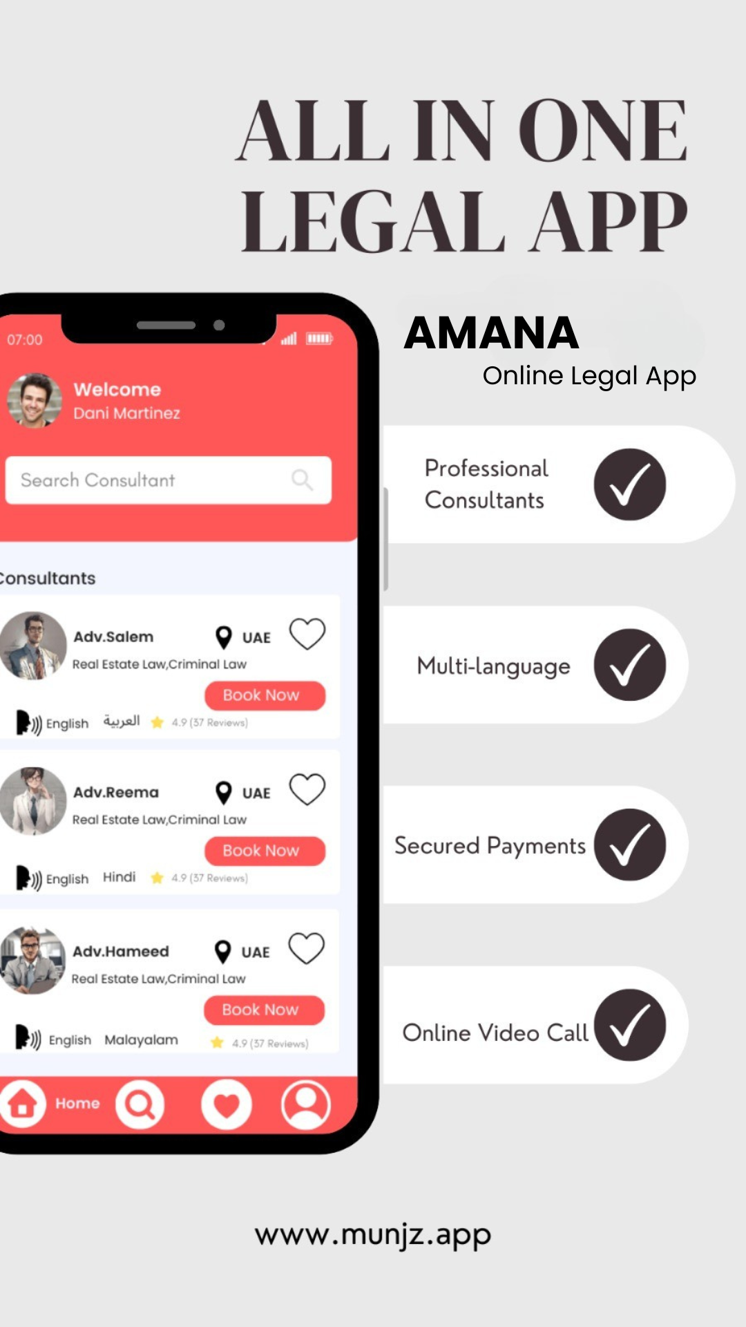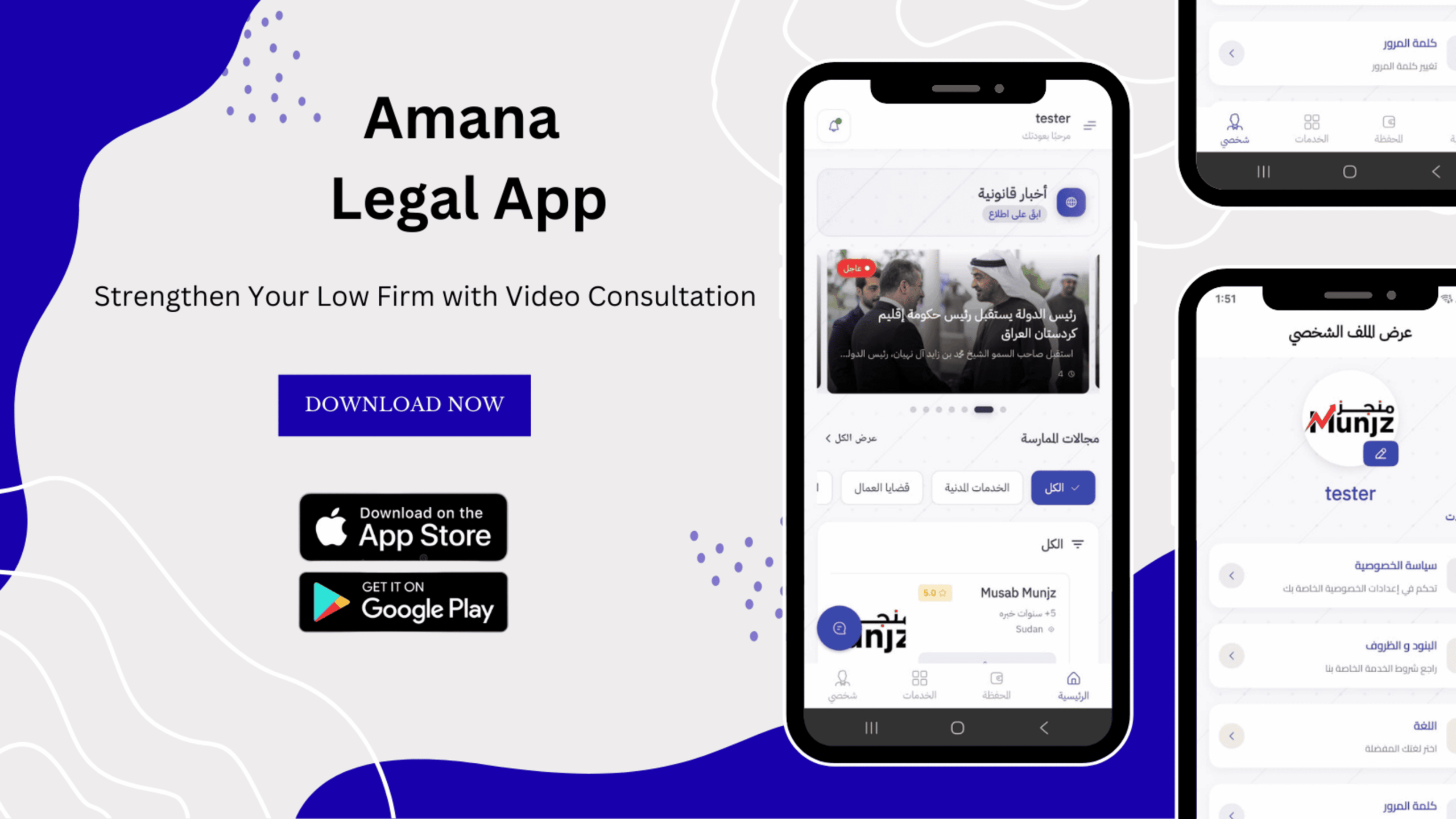 Amana Online Legal App is the best mobile application where you can find the best المستشارون القانونيون حول العالم في تخصصات مختلفة لمواقع مختلفة ويمكنك حجزهم عبر الإنترنت من خلال التطبيق نفسه. خدماتنا هي كاتب العدل، خدمات المحاكم، الأستشارات القانونية، الترجمة القانونية..